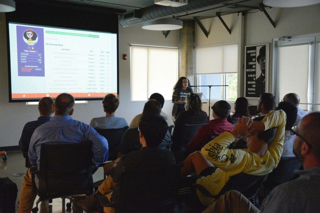 Pictured: Dr. Vasquez speaking at the Nashville Software School to demonstrate software built for users with autism.