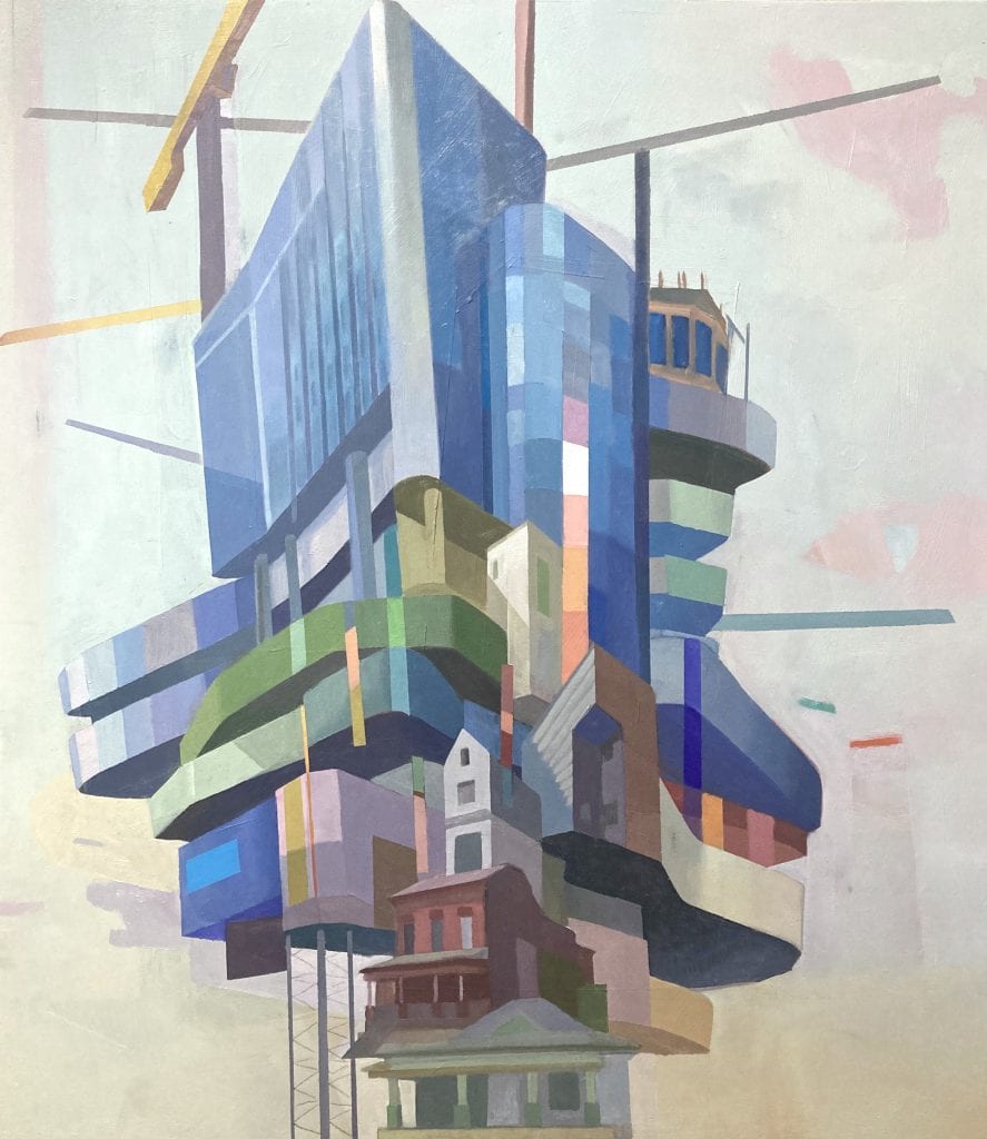 After the conclusion of his Biblical Art series in 2013, Tony wanted to see what else he could do. He had done some other series related to industrial complexes and maps. According to his website, “A chance encounter with a construction crew while painting on location in 2016 challenged me to pursue an unlikely muse: the construction site. Since then I’ve developed the language of construction to frame my portrait of Nashville as a work in progress.”