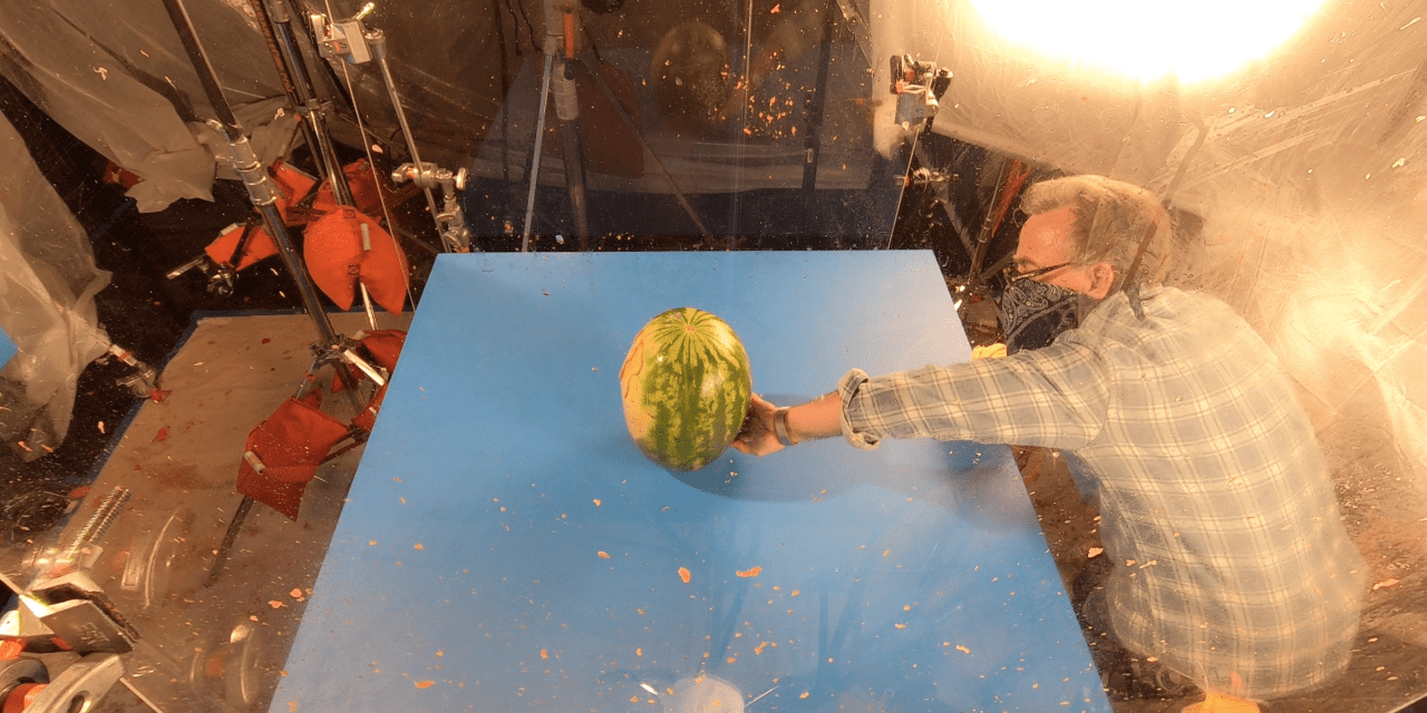 “We shot it exploding, [with] ice cubes also flying at the watermelon. Ice cubes are also inside the watermelon, so it’s just this giant explosion…” he says. “The way that the commercial works is that we show that in reverse, basically. So you’re starting with the bottle of Major Melon, and then the explosion is happening in reverse. Then, the watermelon envelopes the bottle of Major Melon.”