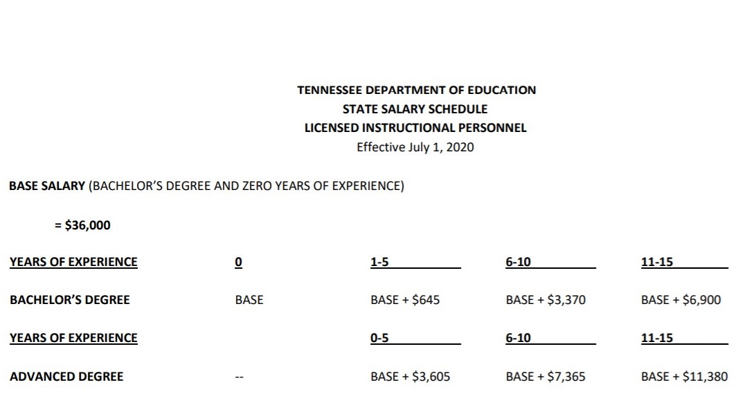 The Governor is referring to the Tennessee Department of Education’s State Salary Schedule for Licensed Instructional Personnel.  The Tennessee Department of Education’s State Salary Schedule for Licensed Instructional Personnel defines the minimum salary a Tennessee teacher shall be paid based upon their degree and years of experience.  Below is the 2020–2021 Tennessee State Salary Schedule for teachers.