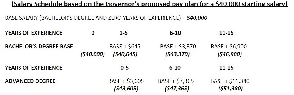 Below is a State Salary Schedule for Licensed Instructional Personnel based on a starting teacher salary of $40,000 per the Governor’s pay plan.