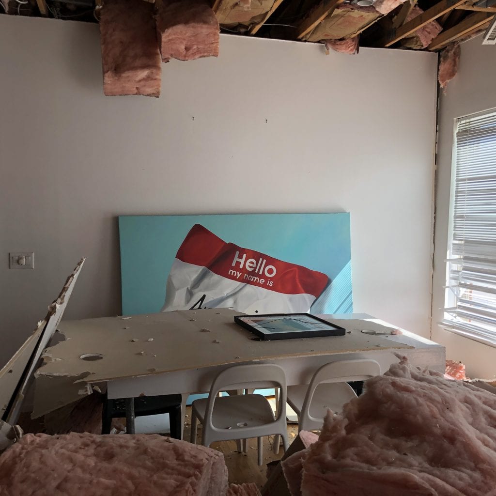 Ashley recalls, “This painting survived the tornado last year and now has become a bit of a poster child for what Gary and the news called ‘Crumpled Optimism’ in a recent interview. Gary, Kristin the artist, and myself all decided to change the name of the painting because it felt so fitting.” It should be noted that the painting was sent back to Studio 208 during the renovation of Gary’s home, and not his office, which was located on 2nd Avenue in immediate proximity to the bomb’s blast.
