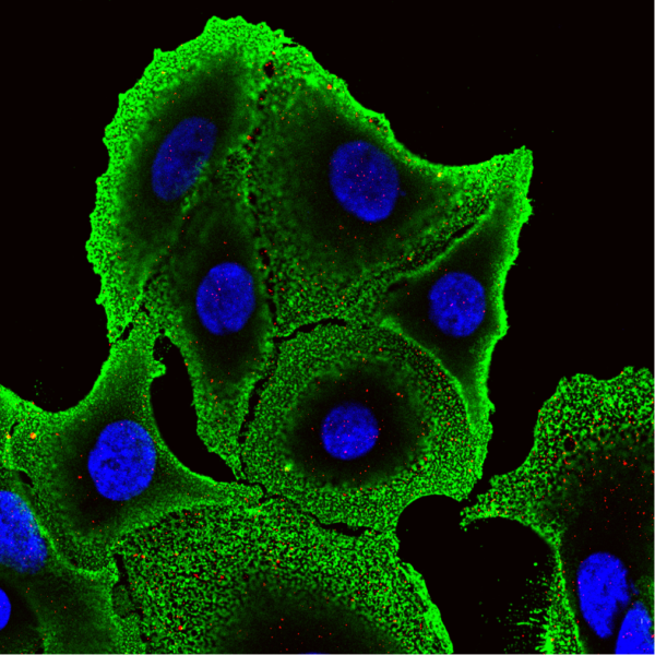 Pictured: Chemoresistant SW480 colon cancer cells stained for lipid rafts (green), death receptor 4 (red) and cell nuclei (blue). Image taken by Joshua Greenlee using a Zeiss LSM 880 from the Vanderbilt Cell Imaging Shared Resource Center.